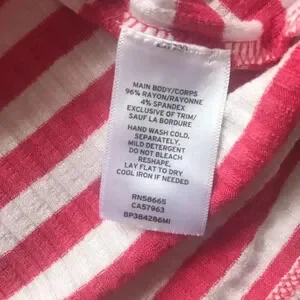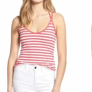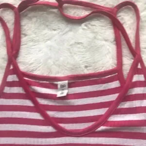 Pink and white ribbed tank with spaghetti straps. Straps cross in the back, fabric is stretchy. 23” length (size Medium). 96% rayon, 4% spandex.