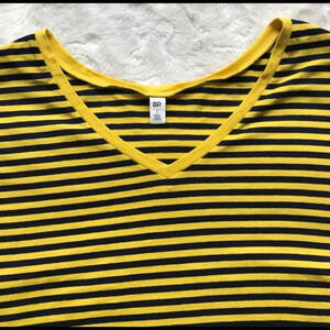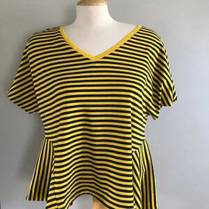 Curved insets at the sides create a swingy, sharkbite hem in this lightweight, striped cotton tee. V-neck, short sleeves, 100% cotton. 23" length (size Medium)