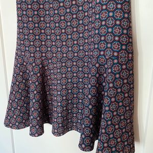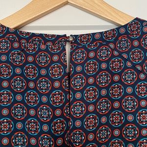 Short sleeve Banana Republic dress with drop waist flounce bottom. Navy blue dress with all over red, light blue & white print. No stretch to fabric, but a beautiful flowy material. Single button closure at the back!