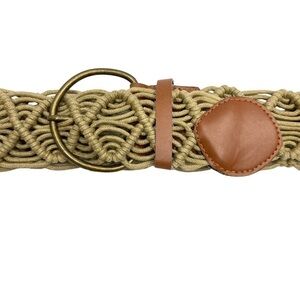 Braided brown macramé style belt with golden metal buckle and leather like details. Leather looks vegan. Perfect to elevate your boho festival outfit. Very good condition. Tiny imperfection showing on picture and no flaws.