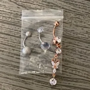 Clear, silver sparkle, and rose gold belly rings. Never Worn!
