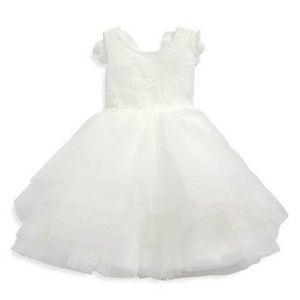 From the Baptism Collection. A charming three dimensional flower V-back tops this special occasion dress with tulle flutter sleeves, an embroidered lace bodice and layered tulle skirt.