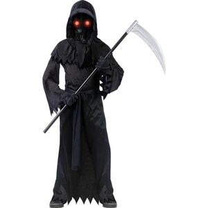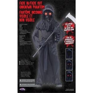 Freak out friends and family when you wear this Fade In & Out Phantom child costume. The black robe comes complete with gloves, a belt, a hood and glasses with light-up eyes feature. The whole neighborhood will be terrified!