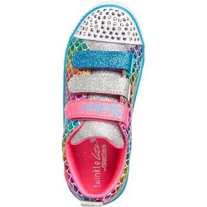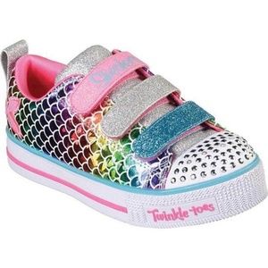 Tip the scales towards magically pretty style with the SKECHERS Twinkle Toes: Twinkle Lite - Sparkle Scales shoe. Glittering metallic glitter finish scale-print fabric and glitter finish fabric upper in a three strap front casual light-up sneaker with stitching and overlay accents.