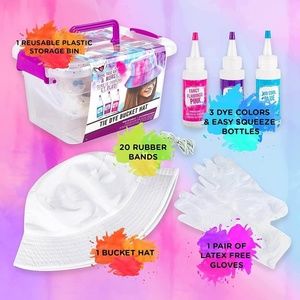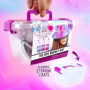 Learn the art of tie-dying with this on-trend kit. Create a dreamy combination of colours using the blue, green and pink dyes. The finished result is always perfect and looks exactly like the high-priced bucket hats seen in boutiques. Dye comes in easy to fill and apply bottles and the necessary rubber bands and non-latex gloves are inside the re-usable plastic crate. Use this adorable crate for dying your masterpiece making this a mess-free project.Hat designed to be one size fits all. Perfect gift for tweens.