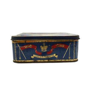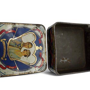 This rare 1940's vintage Britannia Biscuits tin features a regal design with portraits of King George VI and Queen Elizabeth, capturing a historical era.