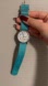 Charming Timex watch with Snoopy and floral accents. Blue strap enhances the playful design.