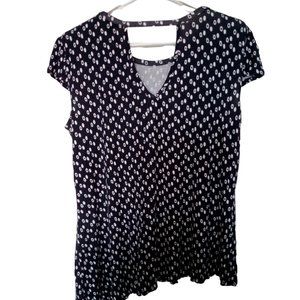 Flattering asymmetrical top with a little bit of stretch and short v-neck feature on back of top. In good pre-owned condition.