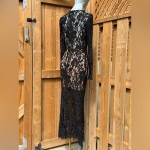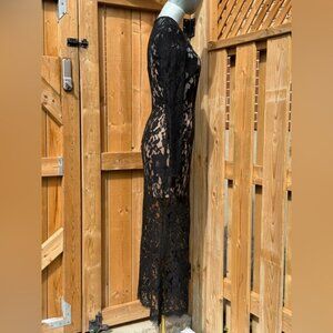 This Bronx and Banco dress features a long-sleeve, floor-length design with intricate lace detailing, offering an elegant and sophisticated look. Pair it with minimalist heels and simple jewelry to let the dress's detailed pattern stand out at any formal event.