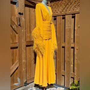🆕 BRONX & BANCO 🧿 NWOT Geisha Feather-Trim Maxi Dress, Mustard - Sz S US 4