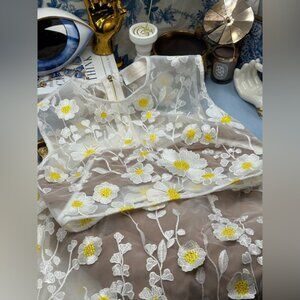 Organza fabric with floral appliqués throughout