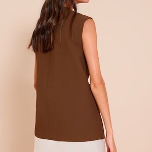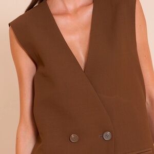 Keep it simple with this brown boxy oversized vest. Crafted from brown material, this vest features double buttons, faux pocket detailing and an oversized fit. Dress it up with a mini skirt, slip on mule heels and understated gold jewelry.