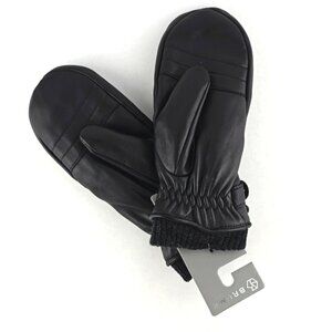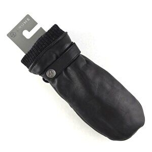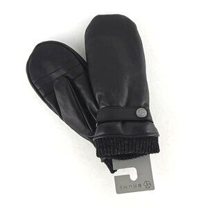 New with tags, BRUME Bromont women's black genuine leather mittens with an ultra soft plush lining and fitted knit ribbed cuffs, size Small.