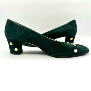 (meta: Bruno Magli green suede leather pumps, women's size 38.5. Vintage block heels, gold ornament detail, almond toe. Rare 80s style, excellent vintage condition with natural signs of wear.)