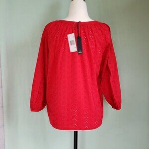 BUFFALO Red eyelet flowers 3/4 sleeve tie-front cotton blouse