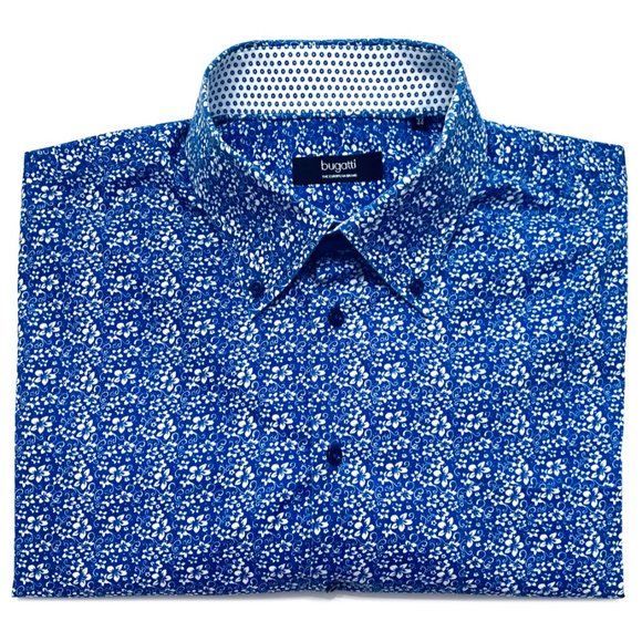 Diversity, innovation and tradition with an international appeal have been the foundation for the Bugatti brand since 1978. This 100% cotton, floral-patterned shirt is a perfect addition to your wardrobe no matter the season. Features single chest pocket, logo on right sleeve, shirttail hem, contrasting barrel cuffs and collar. Size: Men's 44 (armpit to armpit 25”; length 31”; sleeve length 26”). BRAND NEW, never worn.