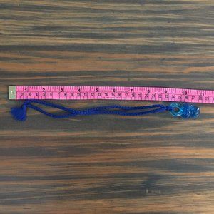90s rave style pacifier necklace in transparent blue with chunks of glitter suspended inside, on dark blue braided nylon(?) cord. Cord measures APPROXIMATELY 9 to 9½" / 23 to 24.5cm (as shown in photo; full length roughly 18-19" / 46-48cm). Dates to somewhere between the late 90s and early 2000s.
