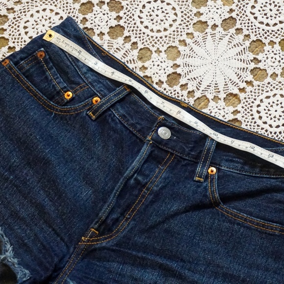 Both pairs are lightly worn. They're naturally distressed on the edges from the manufacturing, with no extra tears, stains, or discolouration. Both shorts don't have a zipper, rather, they have 4 buttons to do them up.