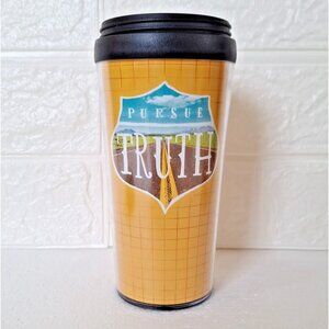 There is a hot/cold beverage with the expression "Pursue Truth" yellow in colour.