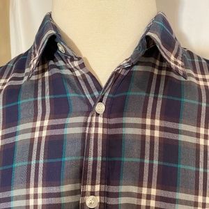 Burberry Brit mens button down plaid shirt. Size XL. Navy, turquoise and white plaid. Authentic. Burberry on all buttons. Lightweight material perfect for layering. 100% cotton.