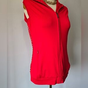 Gorgeous, luxury burberry red sleeveless hoodie vest. Made from a durable, flexible and moisture wicking polyamide. Signature burberry plaid down the sides. Two front zippered pockets. Branded front zipper closure. Rubber branded plate.