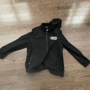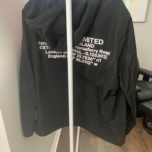A lightweight hooded jacket in shape-memory taffeta stamped with the geographical coordinates of our global HQ in Westminster London. Outer: 100% polyester Upper body lining: 100% polyester Two-way zip closure Side zip pockets interior zip pocket Drawcord hood and hem Press-stud cuffs Machine wash Imported