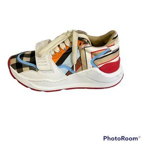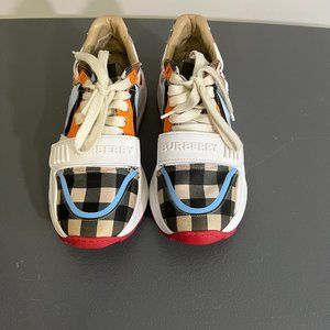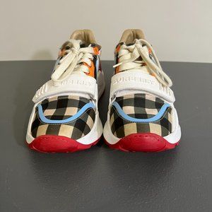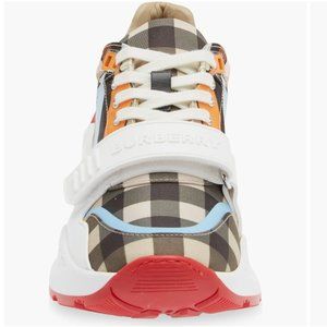 A chunky sole waves up to meet the mixed stripes and checks on this runway-featured sneaker with a logo-embossed hook-and-loop strap enhancing the retro vibe.
