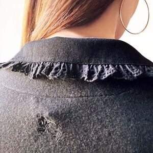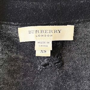 Authentic BURBERRY Vintage Lace Trim Collar Button & Skinny Tie Belt Cardigan. Elegant soft lightweight silk and cashmere blend cardigan in a bold jet black colour. Features a V-neck, 2 open pockets, 10 logo marked button front, a rounded eyelet ruffle trim collar, embroidered logo back, straight hem, side belt loops and skinny self tie belt that cinches the waist with a slight stretch material, for a sophisticated fitted silhouette Adds feminine chic charm to your refined lux Burberry look.