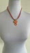 Butler signed pendant has two luminescent pink areas, one oval, one triangular. the pieces are articulated and there is clear rhinestone and gold tone metal embellishment. Signature on the back. The pendant is strung onto a triple cord, one is leather and the other two are fabric cord. Chain 2" long to adjust the length of the necklace. Please see photos for approximate measurements.