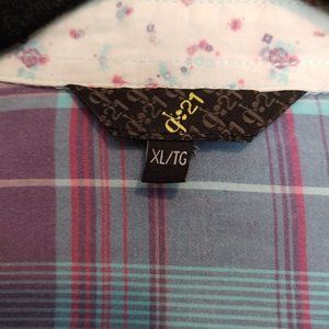 100% cotton size XL. Has breast pockets and adjustable sleeves. Measures 27" from shoulder to hem and 22" from armpit to armpit.
