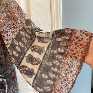 Style is in full force in this one shoulder blouse by Rustic West, size XL. This is a lighter fabric with the body lined in black and the single bell sleeve left sheer for maximum effect. The fabric is a beautiful pattern in blue, orange, rust and gray and, in this tunic length, looks stunning with leggings, jogging, jeans and capris. Colours are best represented by the close up pictures.