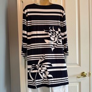 This is a “go anywhere” tunic top from Chico’s. Wear it to work, out for dinner or any casual occasion - it fits the bill for just about any outing! This V-neck tunic is in a navy and white stripe/floral combo design in a polyester-spandex fabric that is machine washable. The three quarter length sleeves and split hem make this a comfort garment in every sense of the word - it pairs well with capris and leggings and really pops with anything white! This tunic top is a Chico’s size 3 which equals size 16 or an XL - (see last picture for Chico’s size chart) but please refer to the measurements below to ensure the best fit.