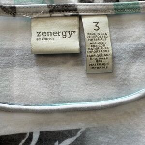 For those who like tunic style tops here’s one that is comfortable and stylish - with the quality that you can count on from Zenergy - Chico’s brand for athleisure and loungewear. Black stripes blend into muted blue florals on a white background in a soft and easy care polyester spandex blend that is machine washable. A scoop neck, three quarter sleeves and asymmetrical hem are all features of this gorgeous tunic top.
