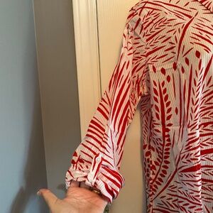 Versatility thy name is Chico’s! This white and red patterned blouse from Chico’s can be worn buttoned up and tucked in or left out - or you can wear it unbuttoned as a long sleeve lightweight jacket over a tank or camisole - or you can roll up the sleeves to 3/4 length and wear it in any of the previously mentioned styles. The hem on this gorgeous lightweight blouse is slightly longer in the back and the way that you wear it is totally up to you! The light fabric is 100% cotton for maximum breathability and machine wash for maximum ease of care. Chico’s size 2 equals a regular size 12 and measurements are provided below.