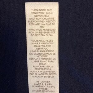 This top from Chico’s is made from a wonderfully soft fabric that is a blend of Viscose and Spandex. The sleeves and back are solid navy while the front has a beautiful intricate gold pattern and features dark blue beading and sequins on the shoulders. This is a hi-low top - the front hem reaches the hips and the back covers your “assets”. It is a stylish top that also happens to be very comfortable. This is a Chico’s size 2 which equals a size 12 or Large.