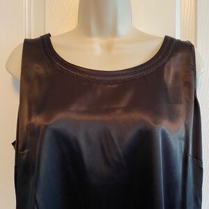 Treat yourself to the rich look and feel of satin in this poly spandex sleeveless blouse from Chico’s.This is a class act that has stylish touches like the lace band detailing on the rounded neckline and the split on each side of the hem. You’ll shimmer and shine whether you pair this slightly A-line sleeveless blouse with a pant suit for work or a pair of jeans and a denim jacket on the weekend. Classic black and satin have always been meant for each other and they come together beautifully in this classy blouse that flatters the figure. Chico’s size 2 equals a regular size 12 and this fabric has very little stretch so please note the measurements below.