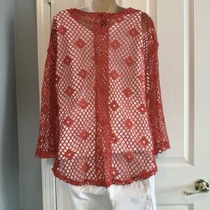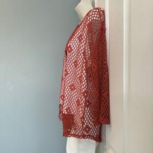 This breezy jacket from Multiples will energize any outfit! The laser cut out design in the polyester fabric gives the impression of a loosely worked crochet pattern but the fabric lays flat and comfortable on your skin. The three quarter sleeves are generous in diameter and the V neckline is created when the large wooden button is secured. Areas around the button and buttonhole are reinforced with solid fabric in the same shade as the fabric. There is a parting of fabric at the back seams for ease of movement and the entire jacket is relaxed fit with some stretch to the fabric - measurements are below. The colour is more of a burnt orange than a true orange - the picture where I am holding up the one sleeve is the best for showing the true colour. There is a white top underneath the jacket that is not part of the listing - this is for the jacket only.