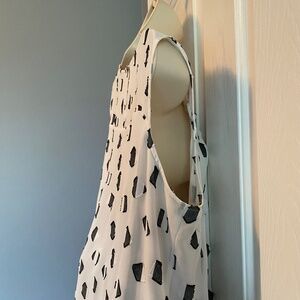 Here’s a beautiful top from Tommy Hilfiger that can be worn for work or casual! This is a sleeveless, scoop neck blouse in white with black and white diamond patches (frayed at the edges for an extra special touch) scattered evenly across the front and back. This blouse is fully lined but remains slightly sheer. I purchased it for a cruise but never wore it so passing it on. The fabric is 100% polyester.