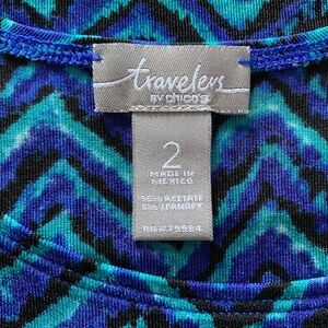 The Travelers line by Chico’s is known for its comfort, easy care and non-wrinkle properties. It doesn’t matter how long you have been wearing this tank top - it’s going to look just as fresh after 10 hours as it did when you first put it on! This colourful dress tank top has a gorgeous chevron design in shades of blue with black and the fabric is an acetate spandex blend with lots of stretch and easy care as it’s machine washable.