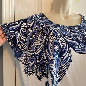 Comfort and style pair up in this dressy T-shirt from Chico’s Zenergy line - creating stylish and comfortable women’s athleisure and loungewear. This T features a U-neck, cap sleeves and slight A-line styling for a flattering fit. The modified paisley pattern, in shades of blue, drapes across the front of the white upper bodice in a diagonal fall that ends halfway down the right side and is a stunning contrast in colour! This T-shirt pairs well with denim, white, navy, purple and… well, you can use your imagination and come up with other ideas as well! The fabric is a blend of cotton, modal and spandex and it is machine washable for easy care. This is a Chico’s size 2 which equals a size 12 in regular sizing. Please see the last picture for the Chico’s size chart and note the measurements below.