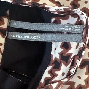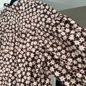 Fun and fabulous BY ANTHROPOLOGIE 3/4-Sleeve Mock-Neck Swing Mini Dress - Size XL. Runs large. Wear with short or tall boots and stomp through Fall! Spunky white and black stars print on brown for a fun, modern look. Wear with big hoop earrings and a ponytail! Add a belt for a different look! Mock collar with back peep hole and covered buttons. Elasticized sleeves, ruffled hem. Extra button on tag.
