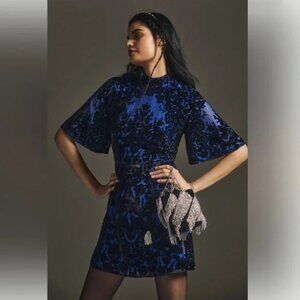 BY ANTHROPOLOGIE Mock-Neck Velvet Mini Dress Open Back Burnout SS Blue