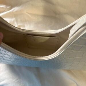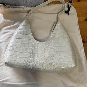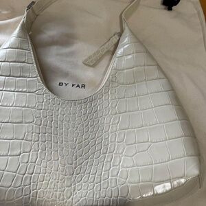 BY FAR Off-White Croc Amber Bag Croc-embossed leather shoulder bag in off-white. Fixed shoulder strap. Zip closure. Three patch pockets and leather logo patch at interior. Tonal twill lining. Silver-tone hardware. Approx. 15" length x 11" height x 3" width. Supplier color: Cream Leather. Made in Spain.