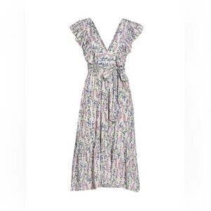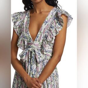 Charming floral dress with feminine ruffled trim. Plunging V-neck Flutter sleeves V-back with concealed button Wrap waist with self-tie Ruffled hem SIZE & FIT About 47” from shoulder to hem Model measurements: 5'10" tall Model is wearing a US size Small byTiMo Dress/White Floral Print Short Sleeve with V-Neck Sash-Tie Closure at Front Fit:Dresses by byTiMo typically fit true to size pit to pit 19--22 adjustable as it is deep v neck Length: 47 Fabric: 100% Viscose Pristine condition Details:No visible signs of wear very similar to doen Audette dress  smart casual work office leggings sweater hoodie zipper snap closure button black pocket flags anthropologie pattern striped faded t shirt free pbasicseople north face faux leather boho vintage bohemian designer cropped corduroy grey nwt denim cutout loose fitting oversized shoulder pads mock neck velvet short long sleeve floral blouse print bell layered bodycon blouse high lo emerald bell zara lantern doen sleeve peplum Aritzia wrap waist business cardo urban athletic romper jumpsuit quarter half zip industrial punk steampunk metal chunky heavy light red black ruffle puff free people khaki tan formal grad prom graduation embellished studded y2k 70s 80s 90s gift present lululemon levis leggings adidas new york nike alice + olivia modern baggy coach distressed winter fall spring summer jacket coat lined i crew zimmerman halter backless disco retro tna wilfred cardigan cable knit studded cozy soft warm strapless spaghett