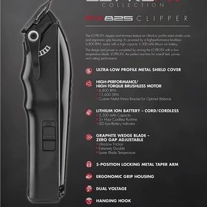 The LoPROFX clippers feature an Ultra-low profile metal shield cover and ergonomic grip housing. It's powered by a high-performance brushless 6,800 RPM motor with a high-capacity 3,300 mAh lithium-ion battery.