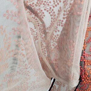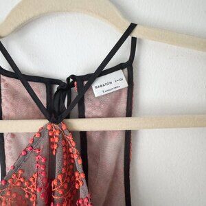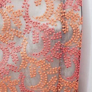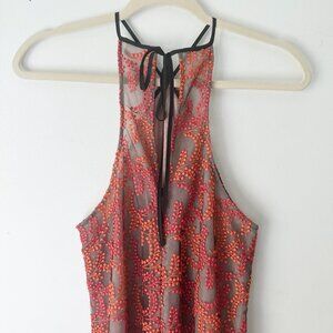 This is a slip-style halter dress with a keyhole cutout in the back and a side slit. It’s made with sheer, embroidered tulle fabric.