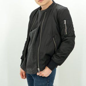 A timeless, sleek, and minimal black Babaton bomber jacket with zipper detail and soft grey jersey lining on the inside. Excellent like-new condition.