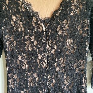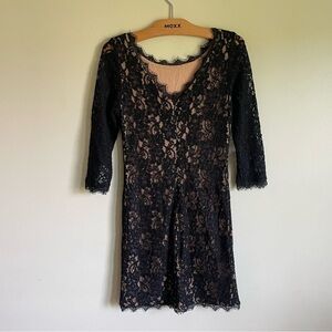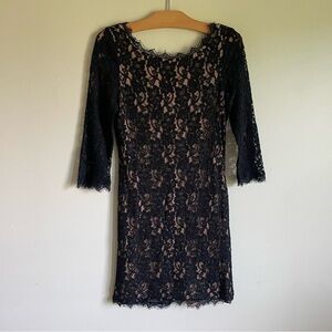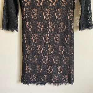 Elegant black lace mini dress. Features three-quarter sleeves. Scalloped edges add a delicate touch. Perfect for evening wear.