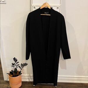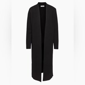 This is a long open-front robe with shoulder pads and fully fashioned construction using a Full Milano stitch with a double-layer structure for a flat, dense feel.