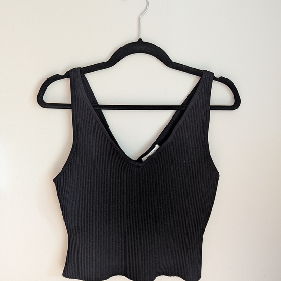 Sleek black ribbed tank top by Babaton. Features a flattering V-neck design. Ideal for layering or wearing alone.